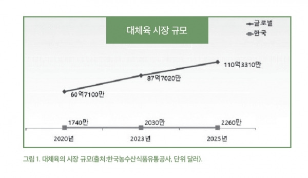 에서는 2020년부터 2025년까지의 시장 규모를 보여주고 있으며, 한국 내 대체육 시장도 빠르게 성장하고 있음을 알 수 있습니다. 2020년에는 6071만 달러에서 2025년에는 2억 2600만 달러로 예상되며, 이는 소비자들의 관심과 수요가 높아짐을 반영합니다.