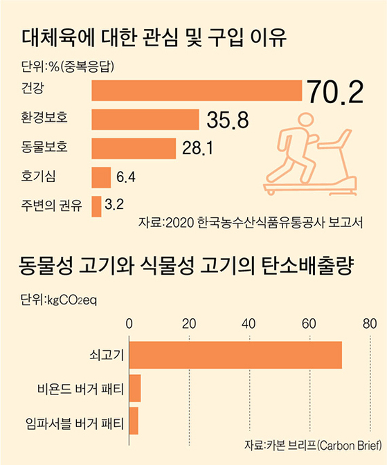 에서는 소비자들이 대체육을 선택하는 이유로 건강, 환경 보호, 동물 복지 등이 높은 비율을 차지하고 있음을 보여줍니다. 또한, 동물성 고기와 비교했을 때 대체육의 생산 과정에서 발생하는 탄소 배출량이 현저히 낮습니다.
