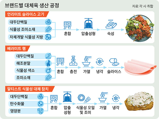 에서는 브랜드별로 다른 대체육의 생산 과정을 보여주고 있습니다. 이 과정은 일반적으로 원료 혼합, 압출, 조리 및 슬라이스 등의 순서로 진행됩니다. 다양한 기술이 접목되어 있어 각 브랜드마다 고유의 맛과 식감을 창출하는 데 기여하고 있습니다. 이와 같은 생산 과정은 품질을 높이고 소비자들에게 더욱 매력적인 대체육을 제공하는 데 중요한 역할을 하고 있습니다.